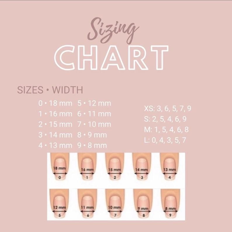 If your nails do not match up with one of the predetermined set sizes, you can order a custom sized set. If ordering a custom set, please enter your nail sizes in the "gift note" box in your cart. Please list your nail sizes in this format: Pinky (9), Ring (7), Middle (5), Index (6), Thumb (3). If sizes vary between your left and right hand, please indicate "L" or "R" for each size. (For example: L Pinky (9), L Ring (7), L Middle (5), L Index (6), L Thumb (3), R Pinky (9), R Ring (7), R Middle (5), R Index (6), R Thumb (3))